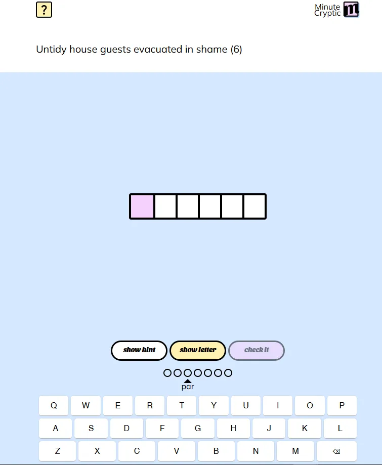 In Minute Cryptic game you must solve the cryptic clue by typing your answer in the grid. When you need some help, ask for a hint or choose to see a random letter in the grid. As you’re helped, your shown count increases. This is your way of measuring how you did and comparing with friends. The par number indicates the typical amount of help a player might need on this clue. If you go under – well done! If over, maybe this just wasn’t your clue. When you fill the grid, the show letter button changes to check answer, and you can see if you got it right!